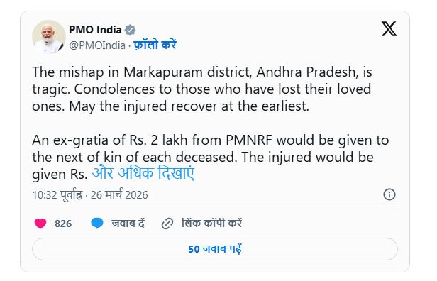 रेवंत रेड्डी ने एक्स पर लिखा है, “मार्कपुरम में हुई बस दुर्घटना से गहरा सदमा लगा है। इस घटना में कई लोगों की मौत की खबर से गहरा दुख हुआ है। मृतकों के परिवारों के प्रति मेरी गहरी संवेदनाएं। घायलों को बेहतर चिकित्सा सहायता सुनिश्चित करने के लिए हम आंध्र प्रदेश सरकार के अधिकारियों के साथ समन्वय कर रहे हैं। मैंने मुख्य सचिव रामकृष्ण राव को निर्देश दिया है कि वे तेलंगाना राज्य के निर्मल से आंध्र प्रदेश के नेल्लोर जा रही इस बस दुर्घटना में मृतकों और घायलों का विवरण प्राप्त करें और युद्धस्तर पर राहत कार्य शुरू करने के लिए आंध्र प्रदेश के अधिकारियों के साथ समन्वय करें।”