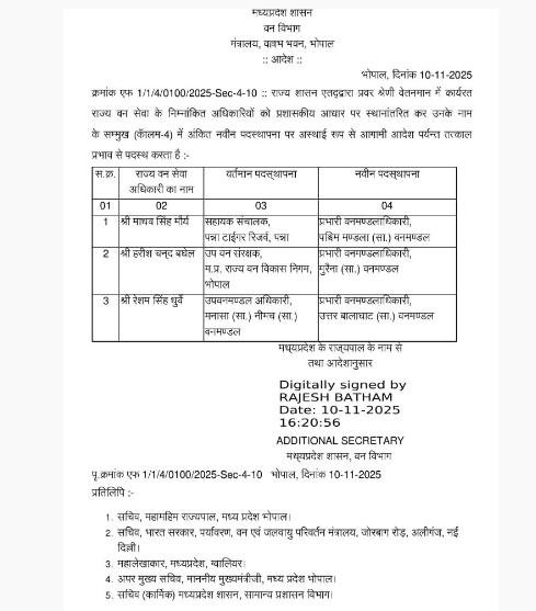मध्य प्रदेश वन विभाग में बड़ा फेरबदल 7 अफसरों के तबादले